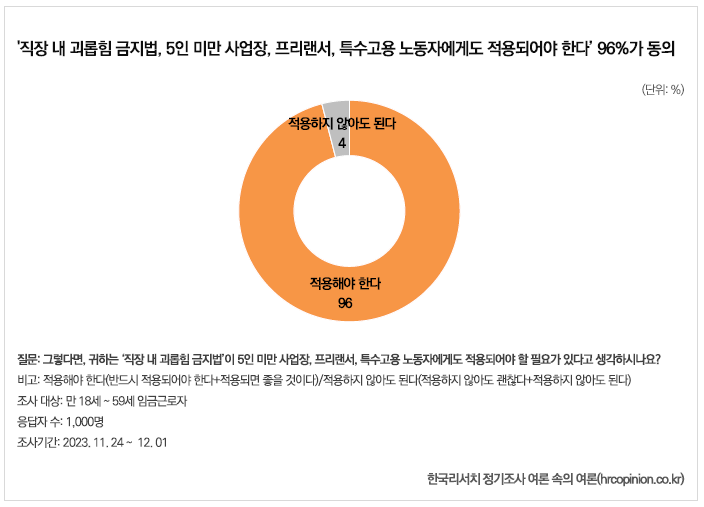 에서 나타난 여론 조사 결과를 보면, 96%의 응답자가 이러한 법이 소규모 사업장에도 적용되어야 한다고 생각하고 있어요. 이는 사회 전반에서 직장 내 괴롭힘에 대한 인식이 변화하고 있다는 것을 보여줘요.